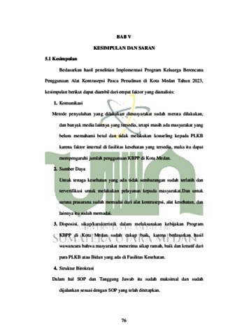 Menurut Peraturan BKKBN No.18 Tahun 2020 Tentang Keluarga Berencana Pasca Persalinan adalah pelayanan KB yang diberikan setelah persalinan sampai dengan kurun waktu 42 (empat puluh dua) hari, dengan tujuan mengatur jarak kelahiran, jarak kehamilan, dan menghindari kehamilan yang tidak diinginkan, sehingga setiap keluarga dapat merencanakan kehamilan yang aman dan sehat. Dinas Pemberdayaan Perempuan dan Perlindungan Anak dan Keluarga Berencana adalah Dinas yang berfungsi memberikan pelayanan KB maupun KBPP untuk masyarakat Kota Medan didapat bahwa penggunaan KBPP di Kota Medan masih rendah. Untuk menganalisis implementasi kebijakan program keluarga berencana penggunaan alat kontrasepsi pasca persalinan di Kota Medan menggunakan metode kualitatif. Informan penelitian ini terdiri dari 8 responden, yang terdiri dari kepala bagian Divisi Sub KB Dinas P3APMP2KB, PLKB, dan Peserta KBPP Kota Medan dengan menggunakan teknik observasi, wawancara mendalam dan dokumentasi. Hasil penelitian menunjukkan bahwa dari teori yang digunakan yaitu teori Edward III dan dari 4 komponen yaitu komunikasi, sumber daya, disposisi, struktur birokrasi yang menjadi penghambat yaitu dari faktor komunikasi dimana masih rendahnya konseling yang dilakukan kepada calon akseptor kepada PLKB mengenai KBPP dan dari faktor disposisi dimana karakteristik dari keluarga calon akseptor yang masih ada melarang untuk menggunakan KB. Hal inilah yang membuat masih rendahnya penggunaan KBPP di Kota Medan