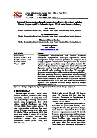 Pratama, Yuda Pengaruh Kepemimpinan Transformasional dan Budaya Organisasi terhadap Kinerja Karyawan di Era Industri 4.0 pada PT. Growth Sumatera Industry. Jurnal Ekonomi dan Bisnis.