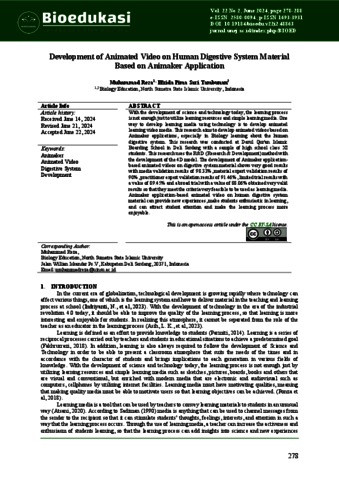 With the development of science and technology today, the learning process is not enough just to utilize learning resources and simple learning media. One way to develop learning media using technology is to develop animated learning video media. This research aims to develop animated videos based on Animaker applications, especially in Biology learning about the human digestive system. This research was conducted at Darul Qur'an Islamic Boarding School in Deli Serdang with a sample of high school class XI students. This research uses the R&D (Research & Development) method with the development of the 4D model. The development of Animaker applicationbased animated videos on digestive system material shows very good results with media validation results of 98.33%, material expert validation results of 90%, practitioner expert validation results of 91.46%, limited trial results with a value of 89.45% and a broad trial with a value of 88.06% obtained very valid results so that they meet the criteria very feasible to be used as learning media. Animaker application-based animated video on human digestive system material can provide new experiences, make students enthusiastic in learning, and can attract student attention and make the learning process more enjoyable.