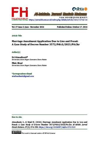 Atmadianti, Sri (2024) Marriage Annulment Application Due to Lies and Fraud: A Case Study of Decree Number 3572/Pdt.G/2023/PA.Ckr. Al-Ishlah: Jurnal Ilmiah Hukum, 27 (2).