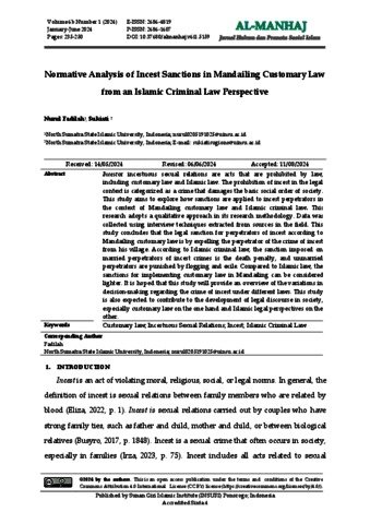 Fadilah, Nurul and Sukiati, Sukiati (2024) Normative Analysis of Incest Sanctions in Mandailing Customary Law from an Islamic Criminal Law Perspective. Al-Manhaj: Jurnal Hukum dan Pranata Sosial Islam, 6 (1). pp. 265-278. ISSN E-2686-4819 P-ISSN 2686-1607.
