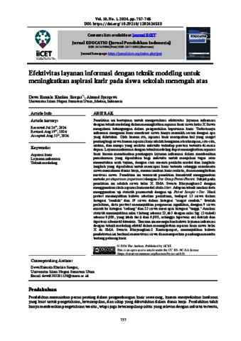 Kumala Kholisa Siregar, Dewi Efektivitas layanan informasi dengan teknik modeling untuk meningkatkan aspirasi karir pada siswa sekolah menengah atas. Jurnal EDUCATIO (Jurnal Pendidikan Indonesia).