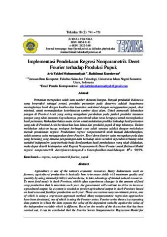 Pertanian merupakan salah satu sumber ekonomi bangsa. Banyak penduduk Indonesia yang berprofesi sebagai petani, produksi pertanian pada dasarnya adalah bagaimana meningkatnya hasil dengan kualitas dan kuantitas maksimal dengan menggunakan pupuk, obat minimal, untuk memanfaatkan keterbatasan sumber daya alam. Untuk memenuhi kebutuhan pangan di Provinsi Aceh yang sering mengalami perubahan pada jumlah produksi tanaman pangan yang tidak menentu tiap tahunnya, pemerintah akan terus berupaya untuk meningkatkan hasil pertanian, Maka diperlukan suatu sistem untuk melakukan prediksi terhadap hasil pertanian yang ada di Provinsi Aceh berdasarkan luas lahan dan produksi pupuk di tiap tahunnya. Dalam melakukan taksiran harga terdapat berbagai cara salah satunya adalah dengan melakukan metode pendekatan regresi. Pendekatan regresi nonparametrik telah banyak dikembangkan, salah satunya yaitu menggunakan deret Fourier. Teori deret fourier yaitu merupakan pola data yang berulang yang dimana pengulangan data terhadap nilai variabel dependen terhadap nilai variabel independen yang berbeda-beda Berdasarkan hasil pembahasan yang telah dilakukan, maka dapat ditarik kesimpulan odel Regresi Nonparamterik Deret Fourier untuk fluktuasi Model regresi nonparametrik deret fourier dengan K = 6 menghasilkan model dengan
