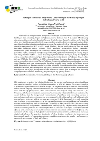 Ujung, Nursholihat (2024) Hubungan Komunikasi Interpersonal Guru Bimbingan dan Konseling dengan Self Efficacy Peserta Didik. JAPKP: Jurnal Administrasi Pendidikan & Konseling Pendidikan, 5 (2).