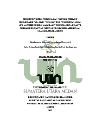 Andreansyah, Fakhri (2023) Pengaruh Strategi Pembelajaran Team Quiz terhadap Hasil Belajar Pada Mata Pelajaran Ilmu Pengetahuan Sosial (IPS) Materi Pluralitas Masyarakat Indonesia Siswa Kelas Vii Madrasah Tsanawiyah Ukhuwah Islamiyah Desa Perhutaan Silau Kec. Pulo Bandring. Skripsi thesis, Universitas Islam Negeri Sumatera Utara Medan.