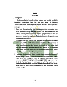 Penelitian ini menyoroti masalah ketidakaktifan siswa dalam proses pembelajaran, di mana siswa lebih sebagai pendengar dan kurang berpartisipasi aktif. Hal ini berdampak pada pemahaman materi yang cenderung rendah, dengan hanya sebagian siswa yang mampu memahami dengan baik, sementara siswa lainnya mengalami kesulitan. Untuk mengatasi permasalahan tersebut, peneliti tertarik untuk menguji metode aktif belajar, khususnya metode Team Quiz. Penelitian ini menggunakan pendekatan eksperimental dengan desain Pretest-Posttest Control Group untuk membandingkan hasil belajar antara kelas eksperimen yang menerapkan metode Team Quiz dan kelas kontrol yang tidak. Hasil penelitian menunjukkan bahwa terdapat peningkatan hasil belajar pada kelas eksperimen yang menggunakan metode Team Quiz, dengan sebagian besar siswa mencapai atau melebihi KKM. Hal ini menandakan keefektifan metode Team Quiz dalam meningkatkan hasil belajar siswa.