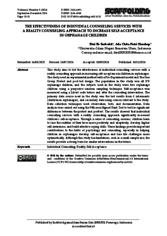 Br Surbakti, Fitri and Harahap, Ade Chita Putri (2024) THE EFFECTIVENESS OF INDIVIDUAL COUNSELING SERVICES WITH A REALITY COUNSELING APPROACH TO INCREASE SELF-ACCEPTANCE IN ORPHANAGE CHILDREN. Scaffolding: Jurnal Pendidikan Islam dan Multikulturalisme, 6 (3). pp. 13-31. ISSN E-2656-4491, P-ISSN: 2656-4548