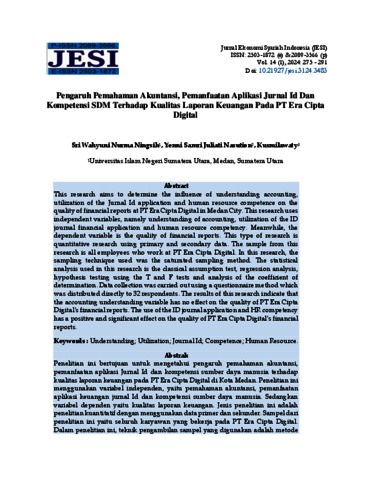Ningsih, Sri Wahyuni Nurma (2024) Pengaruh Pemahaman Akuntansi, Pemanfaatan Aplikasi Jurnal Id Dan Kompetensi SDM Terhadap Kualitas Laporan Keuangan Pada PT Era Cipta Digital. Jurnal Ekonomi Syariah Indonesia (JESI), 14 (1).