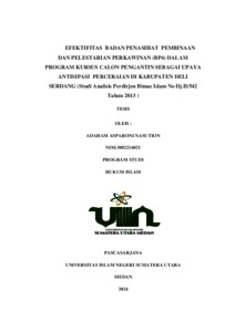 Efektifitas Badan Penasihatan Pembinaan Dan Pelestarian Perkawinan (BP4) Dalam Program Kursus Calon Pengantin Sebagai Upaya Antisipasi Perceraian di Kabupaten Deli Serdang. Penelitian ini berbentuk kualitatif Diskriptif Yuridis empiris membahas terkait persoalan Peraturan Direktur Jenderal Bimbingan Masyarakat Islam No. DJ.II/542 tahun 2013 tentang Pedoman Penyelenggaraan Kursus Pra Nikah, namun pada prakteknya ditemukan data bahwa pada umumnya tahun 2014 sebanyak 356 pasangan, 2015 sebanyak 352 pasang dan tahun 2016 sebanyak 359 pasang calon pengantin baru di tiga Kecamatan (Percut Sei Tuan, Hamparan Perak dan Sibolangit) Kabupaten Deli Serdang tidak melakukan kursus pra nikah namun mereka memilik sertifikat pra nikah. Berdasarkan temuan inilah, penelitian dilakukan. Adapun tujuan tesis ini, mengetahui program BP4 yang sudah dilaksanakan, Angka perceraian dan efektifitas BP4 untuk menekan angka perceraian dengan ketentuan kursus nikah dalam Peraturan Direktur Jenderal Bimbingan Masyarakat Islam Nomor: DJ.II/542 Tahun 2013 Tentang Pedoman Penyelenggaraan Kursus Calon Pengantin, dan mengetahui efektifitas kursus pra nikah bagi BP4 di Kabupaten Deli Serdang. Adapun langkah-langkah yang digunakan dalam penelitian ini yaitu dimulai dari pengumpulan data, baik yang primer maupun yang sekunder. Data-data tersebut akan ditelusuri dalam literatur yang dipandang relevan. Setelah penulis meneliti dan menganalisa, penulis mengambil kesimpulan bahwa efektifitas kursus Calon Pengantin bagi BP4 di Kabupaten Deli Serdang, Pengadilan Agama Lubuk Pakam memberikan penjelasan terkait data perceraian dibuktikan dengan Akta Cerai di tahun 2021 sebanyak 2792, di tahun 2022 sebanyak 2715 dan di tahun 2023 sebanyak 2539 pasang. bahwa jika di rata-ratakan pertahun maka angka perceraian berkurang sebanyak 2,7 % pertahun. Adapun hasil penelitin ini bahwa urutan perceraian di PA lubuk Pakam meliputi Perselisihan dan pertengkaran terus menerus, Meninggalkan salah satu pihak, murtad, di hukum penjara, KDRT dan poligami. Maka dapat di simpulkan bahwa kursus calon pengantin belum efektif dalam menekan angka perceraian khususnya di daerah Kabupaten Deli Serdang.