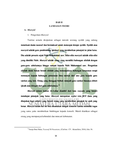 Skripsi ini berjudul “Peran Mursyid Sebagai Pembimbing Rohani Dalam Tarekat Naqsabandiyah Al-Kholidiyah Jalaliyah Di Desa Marendal I Jalan Kongsi Gang Leman Harahap”. Dalam skripsi ini penulis ingin mengungkapkan peran seorang Mursyid sebagai konselor dalam sebuah Tarekat. Alasan penulis melakukan penelitian dan kemudian menyusunnya untuk menjadi sebuah skripsi yaitu karena dalam kitab Ihya Ulumuddin karangan Imam Ghazali terdapat kesamaan antara tugas seorang Mursyid dengan tugas seorang konselor, yaitu mempunyai tugas yang samasama membimbing atau mengarahkan seseorang yang memiliki permasalahan. Kesamaan tugas inilah yang membuat penulis menarik judul skripsi ini. Tujuan penelitian ini dilakukan yaitu untuk mengetahui peran Mursyid sebagai seorang konselor dalam membimbing para salik (muridnya) selain itu juga penulis ingin mengetahui proses konseling yang dilakukan oleh seorang Mursyid kepada saliknya. Penelitian ini dilakukan dengan menggunakan pendekatan kualitatif sedangkan jenis penelitiannya menggunakan jenis penelitian kualitatif deskriptif, yaitu dengan mendeskripsikan atau menjelaskan suatu kejadian, dalam hal ini penulis akan menjelaska peran seorang Mursyid sebagai konselor dalam sebuah tarekat dan proses konseling yang dilakukan Mursyid kepada Salik (Muridnya). Sedangkan teknik pengumpulan data yang penulis gunakan adalah dengan menggunakan teknik observasi, wawancara dan teknik analisis data. Teknik wawancara yang dilakukan penulis dalam penelitian yaitu dengan menggunakan in depth interview (wawancara mendalam). Jadi, dalam teknik wawancara mendalam ini penulis melakukan proses wawancara dengan Syeikh Muhammad Ali selaku Mursyid dan beberapa orang Murid (Salik).