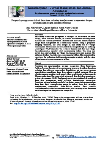 Sari, Ayu Aldira (2024) Pengaruh penggunaan alokasi dana desa terhadap kesejahteraan masyarakat dengan akuntabilitas sebagai variabel moderasi. Keberlanjutan : Jurnal Manajemen dan Jurnal Akuntansi, 9 (1). pp. 72-82.
