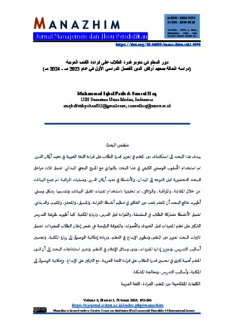 يهدف هذا البحث إلى استكشاف دور املعلم في تعزيز قدرة الطالب على قراءة اللغةالعربيةفي معهد أركان الدين. تم استخدام األسلوب الوصفي الكيفي في هذا البحث بالتوازي مع املنهج البحثي امليداني. تشمل ثالث مراحل للبحث التحضيرية قبل التوجه إلى امليدان، واألنشطة في معهد أركان الدين، وعمليات املراقبة. تم جمع البيانات من خالل املقابلة، واملراقبة، والوثائق، تم تحليلها باستخدام تقنيات تقليل البيانات وتقديمها بشكل وصفي. أظهرتنتائج البحثأن املعلم يلعب دورالخالق فيتنظيم أنشطةالقراءة،واملسهل،واملحفز،واملقيم،والدينامي. تشمل األنشطة مشاركة الطالب في السلسلة، والقراءة قبل الدرس، وزيارة املكتبة. كما أظهرت طريقة التدريس التركيز على تعلم املفردات قبل الحروف واألصوات. واملعوقة الرئيسة هي نقص إتقان الطالب للمفردات. تشمل تاثيرات البحث تعزيز دور املعلم، وتطوير اإلبداع في التعلم، وزيادة إمكانية الوصول إلى زيارة املكتبة، وتحسين أساليب التدريس، وتعزيز إدارة املفردات، ودور وسائل اإلعالم في التعلم. وتشير استنتاجات البحث إلى أن لدور املعلم أهميةكبرى فيتحسين قدرة الطالبعلىقراءة اللغةالعربية،معالتركيز علىاإلبداع،وإمكانيةالوصول إلى املكتبة،وأساليبالتدريس،ومعالجةاملشكلة.