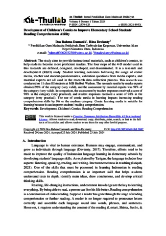 Damanik, Dea Rahma (2024) Development of Children's Comics to Improve Elementary School Students' Reading Comprehension Ability. At-Thullab: Jurnal Pendidikan Guru Madrasah Ibtidaiyah. ISSN : 2579-625
