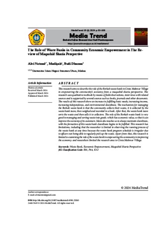 Natzmi, Alvi (2024) The Role of Waste Banks in Community Economic Empowerment in The Review of Maqashid Sharia Perspective. Media Trend Berkala Kajian Ekonomi dan Studi Pembangunan.
