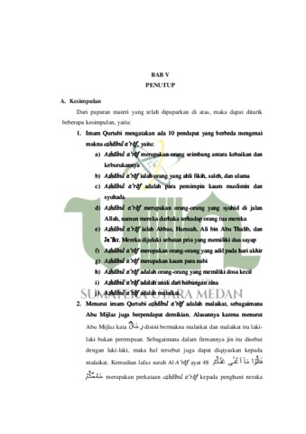 Kehidupan di dunia hanyalah sementara. Adapun kehidupan yang sesungguhnya adalah kehidupan di akhirat kelak. Mayoritas umat Islam hanya mengetahui adanya surga dan neraka saja. Akan tetapi ada sebuah tempat yang berada di antara surga dan neraka yaitu a‘rāf sebagaimana telah Allah sebutkan dalam surah Al-A‘rāf ayat 46-49. A‘rāf merupakan pagar pembatas antara surga dan neraka dan diatasnya terdapat orang-orang. Adapun orang-orang yang berada di atas a‘rāf disebut aṣḥābul a‘rāf. Terdapat banyak perbedaan pendapat mengenai siapakah yang dimaksud dengan aṣḥābul a‘rāf. Ada yang mengatakan mereka adalah orang-orang yang imbang antara kebaikan dan keburukan. Banyak juga yang mengatakan bahwa mereka adalah ahli ulama, para nabi, dan sekelompok orang yang memiliki kedudukan tertinggi di sisi Allah. Dalam penelitian ini, penulis bertujuan untuk meneliti makna aṣḥābul a‘rāf dalam pandangan imam Qurtubi, faktor-faktor yang melatarbelakangi penafsirannya, dan sekaligus dampak penafsirannya. Jenis penelitian yang digunakan adalah penelitian kualitatif yang bersifat deskriptif. Kemudian pendekatan yang digunakan adalah kepustakaan (library research). Hasil penelitian yang ditemukan penulis yaitu terdapat sepuluh pendapat mengenai makna aṣḥābul a‘rāf yang dikutip oleh imam Qurtubi dalam tafsir AlJāmi‘ Li Aḥkām Al-Qur’ān. Kemudian ada satu pendapat yang ditarjih oleh imam Qurtubi yang mengatakan bahwa makna aṣḥābul a‘rāf adalah malaikat. Hal tersebut berdasarkan riwayat Abu Mijlaz yang mengatakan bahwa kata ل جاَ رِ disini bermakna malaikat dan malaikat itu adalah laki-laki bukan perempuan. Sehingga tidak mengapa menyebut mereka sebagai laki-laki. Sebagaimana kaum jin disebut dengan laki-laki dalam QS. Al-Jinn: 6, maka hal tersebut juga dapat diqiyaskan kepada malaikat. Kemudian dalam tafsir Al-Qurtubi dikatakan lafaz surah Al-A‘rāf ayat 48 مۡكُ ى َعنۡ ُكۡم َجۡمعُ ٰ اَ ۡغن ۤ َما ۡوا ُ الَق merupakan perkataan aṣḥābul a‘rāf kepada penghuni neraka dan untuk menjelek-jelekkan mereka. Kemudian َجـنَّةَ ََل 49 ayat pada ۡ ُوا ال ۡم تَۡح َزنُۡو َن ُۡد ُخل ا تُ اَنۡ َوََلۤ perkataan merupakan َخۡو ف َعلَۡي ُكۡم aṣḥābul a‘rāf kepada penghuni surga dan sekaligus untuk membuat penghuni neraka semakin sedih dan menyesal. Faktor-faktor yang melatarbelakangi penafsirannya yaitu faktor kebahasaan, faktor historis terjadinya perang pemikiran karena perbedaan ideologi, dan faktor dalil serta riwayat penguat argumentasi.