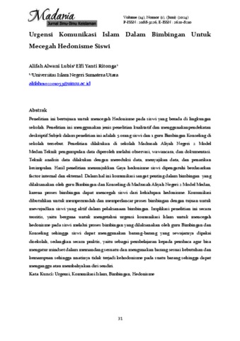 Penelitian ini bertujuan untuk mencegah Hedonisme pada siswi yang berada di lingkungan sekolah. Penelitian ini menggunakan jenis penelitian kualitatif dan menggunakanpendekatan deskriptif.Subjek dalam penelitian ini adalah 5 orang siswi dan 1 guru Bimbingan Konseling di sekolah tersebut. Penelitian dilakukan di sekolah Madrasah Aliyah Negeri 2 Model Medan.Teknik pengumpulan data diperoleh melalui observasi, wawancara, dan dokumentasi. Teknik analisis data dilakukan dengan mereduksi data, menyajikan data, dan penarikan kesimpulan. Hasil penelitian menunjukkan Gaya hedonisme siswi dipengaruhi berdasarkan factor internal dan ekternal. Dalam hal ini komunikasi sangat penting dalam bimbingan yang dilaksanakan oleh guru Bimbingan dan Konseling di Madrasah Aliyah Negeri 2 Model Medan, karena proses bimbingan dapat mencegah siswi dari kehidupan hedonisme. Komunikasi dibutuhkan untuk mempermudah dan memperlancar proses bimbingan dengan tujuan untuk mewujudkan siswi yang aktif dalam pelaksanaan bimbingan. Implikasi penelitian ini secara teoritis, yaitu berguna untuk mengetahui urgensi komunikasi Islam untuk mencegah hedonisme pada siswi melalui proses bimbingan yang dilaksanakan oleh guru Bimbingan dan Konseling sehingga siswi dapat menggunakan barang-barang yang sewajarnya dipakai disekolah, sedangkan secara praktis, yaitu sebagai pembelajaran kepada pembaca agar bisa mengatur mindset dalam memandang sesuatu dan mengunakan barang sesuai kebutuhan dan kemampuan sehingga nnatinya tidak terjadi kehodonisme pada suatu barang sehingga dapat menganggu atau membahyakan diri sendiri.
