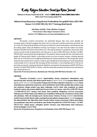 Arifah, Siti Hajar (2024) Hukum Penyediaan Jasa Uang Kertas Peribadatan Perspektif Fatwa DSN-MUI Nomor 112/DSN-MUI/IX/2017 Tentang Akad Ijarah. Reslaj: Religion Education Social Laa Roiba Journal, 6 (8).