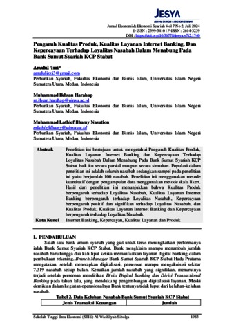 ‘Izzi, Amalul (2024) Pengaruh Kualitas Produk, Kualitas Layanan Internet Banking, Dan Kepercayaan Terhadap Loyalitas Nasabah Dalam Menabung Pada Bank Sumut Syariah KCP Stabat. Jurnal Ekonomi & Ekonomi Syariah, 7 (2).