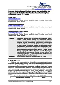 Penelitian ini bertujuan untuk mengetahui Pengaruh Kualitas Produk, Kualitas Layanan Internet Banking dan Kepercayaan Terhadap Loyalitas Nasabah Dalam Menabung Pada Bank Sumut Syariah KCP Stabat baik itu secara parsial maupun secara simultan. Populasi dalam penelitian ini adalah seluruh nasabah sedangkan sampel pada penelitian ini yaitu berjumlah 100 nasabah. Penelitian ini menggunakan metode kuantitatif dengan pengumpulan data menggunakan metode skala likert. Hasil dari penelitian ini menunjukkan bahwa Kualitas Produk berpengaruh terhadap Loyalitas Nasabah, Kualitas Layanan Internet Banking berpengaruh terhadap Loyalitas Nasabah, Kepercayaan berpengaruh positif dan signifikan terhadap Loyalitas Nasabah, dan Kualitas Produk, Kualitas Layanan Internet Banking dan Kepercayaan berpengaruh terhadap Loyalitas Nasabah.