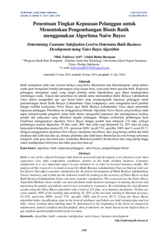Arif, Mhd. Fakhrozi (2024) Penentuan Tingkat Kepuasan Pelanggan untuk Menentukan Pengembangan Bisnis Batik menggunakan Algoritma Naive Bayes. Sistemasi: Jurnal Sistem Informasi.