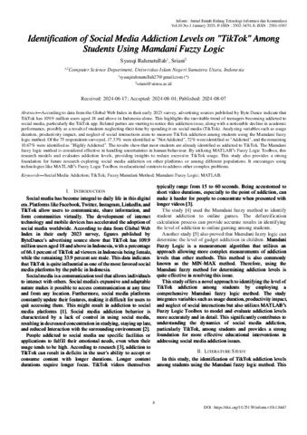 Rahmatullah, Syauqi (2025) Identification of Social Media Addiction Levels on "TikTok" Among Students Using Mamdani Fuzzy Logic. Inform : Jurnal Ilmiah Bidang Teknologi Informasi dan Komunikasi.