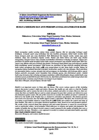 Koto, Aldi (2024) Budaya Misogini dan Anti Perempuan Dalam Literatur Hadis. Al Qalam: Jurnal Ilmiah Keagamaan dan Kemasyarakatan.