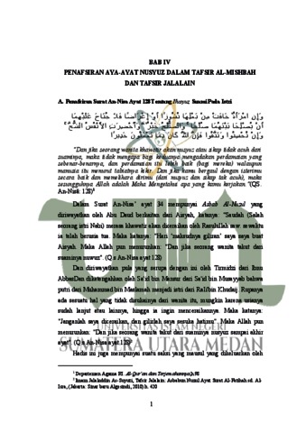 Dalam bahasa Arab, nusyuz (شوزُ ُّالن (adalah turunan dari kata dasar nashz (نشز( yang berarti naik atau menonjol. Kata ini secara harfiah dapat diartikan sebagai perilaku yang menonjol atau menyimpang dari norma.Studi ini juga menganalisis kekhawatiran perempuan terhadap nusyuz, terutama pada usia tua, dan bagaimana QS. An-Nisa: 128 memberikan panduan dalam mengatasi dan mencegah nusyuz. Ayat ini mengajarkan bahwa apabila seorang istri menyadari tanda-tanda nusyuz pada suaminya, maka disarankan untuk mengambil tindakan preventif guna memperbaiki hubungan dan menghindari perceraian yang tidak disukai oleh Allah Swt. Jenis penelitian yang akan digunakan adalah kajian kepustakaan (library research) dan metode penafsiran akan menggunakan metode penafsiran maudu’i dengan penafsiran M. Quraish Shihab dan Imam Jalalain. Penelitian ini mengusulkan berbagai upaya untuk menanggulangi nusyuz, termasuk pembangunan mekanisme penyelesaian sengketa yang efektif, promosi nilai-nilai toleransi dan kerukunan sosial, serta penguatan kepemimpinan dan tata kelola pemerintahan yang baik. Selain itu, penekanan pada pendidikan dan sumber daya, pengawasan hukum yang tegas, serta pembangunan klinik pra-nikah sebagai bentuk layanan untuk mempersiapkan pasangan sebelum menikah menjadi penting. Klinik pra-nikah bertujuan memastikan kesiapan pasangan secara emosional dan praktis, serta mencegah potensi masalah dalam pernikahan, termasuk nusyuz. Penelitian ini memberikan wawasan mengenai pentingnya tindakan preventif dan penyelesaian masalah secara dini dalam mempertahankan keharmonisan rumah tangga. Dalam Tafsir Al-Misbah ada 4 cara menyelesaikan masalah jika terjadi nusyuz terhadap istri, diantaranya: berbicara dan berusaha memperbaiki, cari solusi damai, diperbolehkan rujuk dan bersikap baik dan bertakwa.
