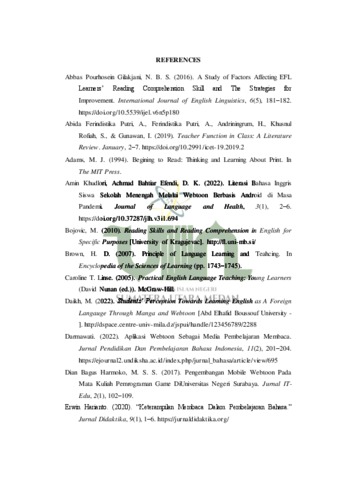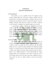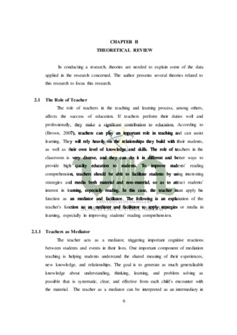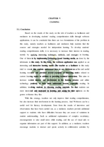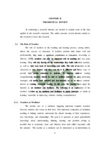 This thesis is entitled "The Role of Teachers In Developing Students’ Reading Comprehension Through The Implementation of Webtoon Application". In learning, the role of teachers is very important to improve students' learning abilities and understanding. This research discusses the role of teachers as facilitators and mediators. This research aims to determine how the role of teachers as facilitators and mediators in the application of webtoon applications to develop students' reading comprehension. This research uses a qualitative case study approach. The methodology used includes semi-participant observation, semistructured interviews, and documentation. Data analysis in this study is data reduction, data display, and drawing conclusions/verification. The results of this research are teachers as facilitators and mediators, by using interesting learning media such as the application of webtoon applications, especially in reading learning, can increase students' interest in reading. This is done by facilitating learning using technology and other means such as preparing materials, laptops, infocus, internet and involving students in choosing materials or reading texts that are appropriate for their age and genre. This research concludes that the use of webtoon has succeeded in increasing students' interest in reading. Students become more interested and motivated to learn more about what they read with increased interest. Ultimately, this increases their ability to understand what they read. Students become better able to understand webtoon texts, which results in better learning.enjoyable for students.