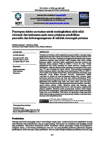 Ritonga, Nabilah (2024) Penerapan hidden curriculum untuk meningkatkan nilai-nilai toleransi dan kerjasama pada mata pelajaran pendidikan pancasila dan kewaraganegaraan di sekolah menengah pertama. Jurnal EDUCATIO (Jurnal Pendidikan Indonesia), 10 (1). pp. 661-669.