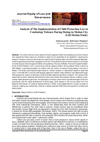 Purba, Selmaria (2022) Analysis of The Implementation of Child Protection Law in Combating Violence During Dating in Medan City (Lbh Medan Study). Journal Equity of Law and Governance, 5 (1).
