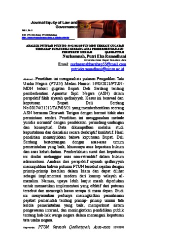 Nurhasanah, Nurhasanah (2024) Analisis Putusan PTUN No: 59/G/2021/PTUN-MDN Terkait Gugatan Terhadap Bupati Deli Serdang Atas Pemberhentian Asn: Perspektif Siyasah Qadhaiyyah. Journal Equity of Law and Governance.