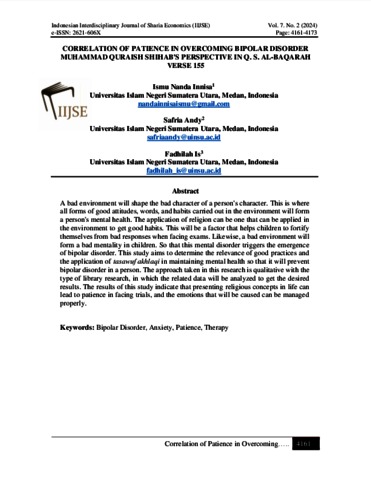 Innisa, Ismu Nanda (2024) Correlation Of Patience in Overcoming Bipolar Disorder Muhammad Quraish Shihab's Perspective in Q. S. Al-Baqarah Verse 155. Indonesian Interdisciplinary Journal of Sharia Economics (IIJSE).