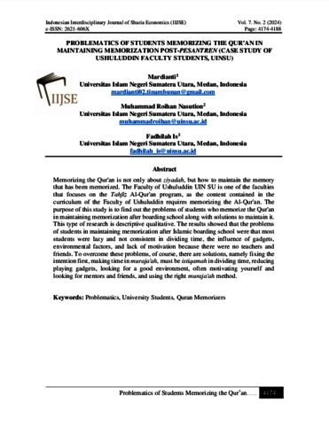 Mardianti, Mardianti (2024) Problematics Of Students Memorizing the Qur'an In Maintaining Memorization Post-Pesantren (Case Study of Ushuluddin Faculty Students, UINSU). Indonesian Interdisciplinary Journal of Sharia Economics (IIJSE).