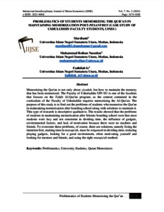Memorizing the Qur'an is not only about ziyadah, but how to maintain the memory that has been memorized. The Faculty of Ushuluddin UIN SU is one of the faculties that focuses on the Tahfiẓ Al-Qur'an program, as the content contained in the curriculum of the Faculty of Ushuluddin requires memorizing the Al-Qur'an. The purpose of this study is to find out the problems of students who memorize the Qur'an in maintaining memorization after boarding school along with solutions to maintain it. This type of research is descriptive qualitative. The results showed that the problems of students in maintaining memorization after Islamic boarding school were that most students were lazy and not consistent in dividing time, the influence of gadgets, environmental factors, and lack of motivation because there were no teachers and friends. To overcome these problems, of course, there are solutions, namely fixing the intention first, making time in muraja'ah, must be istiqamah in dividing time, reducing playing gadgets, looking for a good environment, often motivating yourself and looking for mentors and friends, and using the right muraja'ah method.