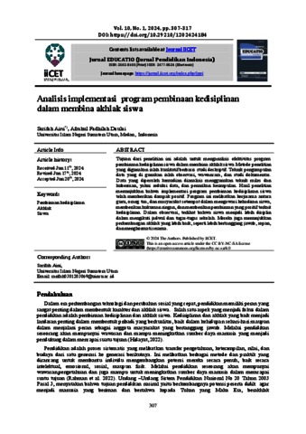 Aini, Sarifah (2024) Analisis implementasi program pembinaan kedisiplinan dalam membina akhlak siswa. Jurnal EDUCATIO (Jurnal Pendidikan Indonesia). ISSN : 2502-8103
