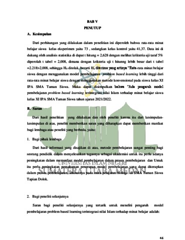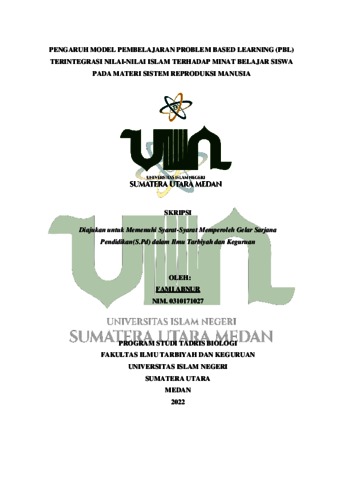 Penelitian ini bertujuan : 1) Untuk mengetahui apakah model pembelajaran Problem Based Learning (PBL) terintegrasi nilai-nilai Islam memberikan pengaruh terhadap minat belajar siswa pada materi sistem reproduksi. 2) Untuk mengetahui apakah model pembelajaran Problem Based Learning (PBL) terintegrasi nilai-nilai Islam tidak memberikan pengaruh terhadap minat belajar siswa pada materi sistem reproduksi. Jenis penelitian yang digunakan dalam penelitian ini adalah penelitian kuantitatif eksperimen. Penelitian ini diperoleh bahwa rata-rata minat belajar siswa kelas eksperimen yaitu 73 , sedangkan kelas kontrol yaitu 41,37. Dan diperoleh thitung>ttabel (2.218>2,008) jadi model pembelajaran Problem Based Learning secara konsisten terhadap minat belajar siswa Kelas XI IPA SMA Taman Siswa Tapian Dolok.