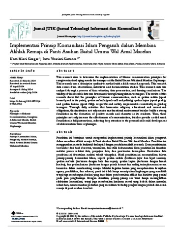 Siregar, Novi Miani (2024) Implementasi Prinsip Komunikasi Islam Pengasuh dalam Membina Akhlak Remaja di Panti Asuhan Baitul Umma Wal Amal Marelan. Jurnal JTIK (Jurnal Teknologi Informasi dan Komunikasi). ISSN 2580-1643