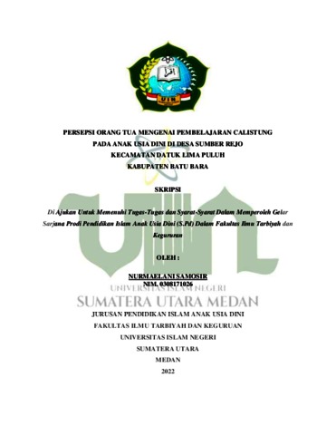 Samosir, Nurmaelani (2024) Persepsi Orang Tua Mengenai Pembelajaran Calistung Pada Anak Usia Dini Di Desa Sumber Rejo Kecamatan Datuk Lima Puluh Kabupaten Batu Bara. Skripsi thesis, Universitas Islam Negeri Sumatra Utara.