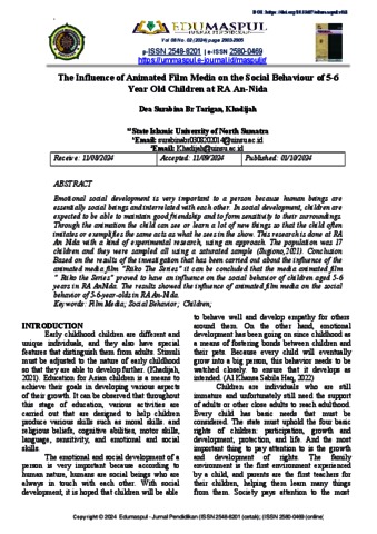 Tarigan, Dea Surabina Br (2024) The Influence of Animated Film Media on the Social Behaviour of 5-6 Year Old Children at RA An-Nida. Edumaspul - Jurnal Pendidikan, 8 (2).