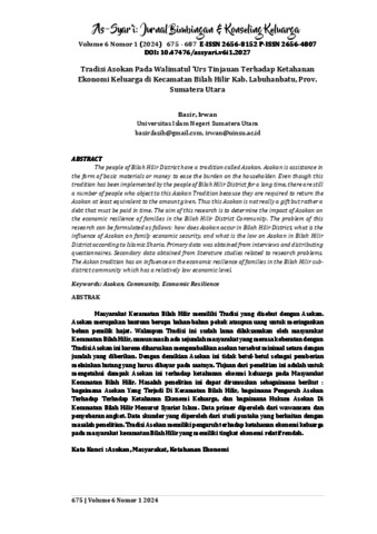 Masyarakat Kecamatan Bilah Hilir memiliki Tradisi yang disebut dengan Asokan. Asokan merupakan bantuan berupa bahan-bahan pokok ataupun uang untuk meringankan beban pemilik hajat. Walaupun Tradisi ini sudah lama dilaksanakan oleh masyarakat Kecamatan Bilah Hilir, namun masih ada sejumlah masyarakat yang merasa keberatan dengan Tradisi Asokan ini karena diharuskan mengembalikan asokan tersebut minimal setara dengan jumlah yang diberikan. Dengan demikian Asokan ini tidak betul-betul sebagai pemberian melainkan hutang yang harus dibayar pada saatnya. Tujuan dari penelitian ini adalah untuk mengetahui dampak Asokan ini terhadap ketahanan ekonmi keluarga pada Masyarakat Kecamatan Bilah Hilir. Masalah penelitian ini dapat dirumuskan sebagaimana berikut : bagaimana Asokan Yang Terjadi Di Kecamatan Bilah Hilir, bagaimana Pengaruh Asokan Terhadap Terhadap Ketahanan Ekonomi Keluarga, dan bagaimana Hukum Asokan Di Kecamatan Bilah Hilir Menurut Syariat Islam. Data primer diperoleh dari wawancara dan penyebaran angket. Data skunder yang diperoleh dari studi pustaka yang berkaitan dengan masalah penelitian. Tradisi Asokan memiliki pengaruh terhadap ketahanan ekonomi keluarga pada masyarakat kecamatan Bilah Hilir yang memiliki tingkat ekonomi relatif rendah.