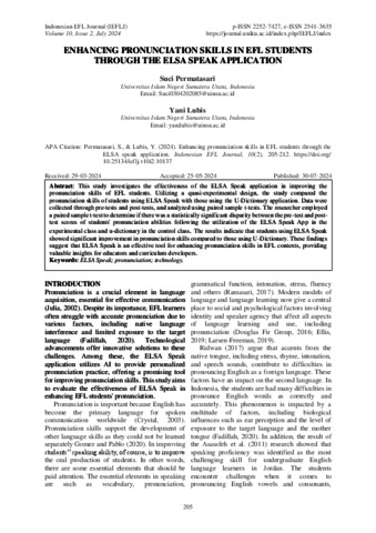 Permatasari, Suci (2024) Enhancing Pronunciation Skills in EFL Students Through the ELSA Speak Application. Indonesian EFL Journal (IEFLJ.