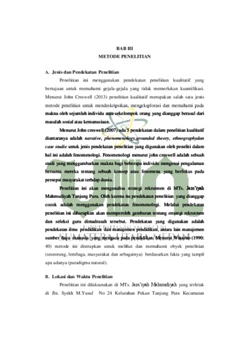 Penelitian ini adalah Strategi Rekrutmen dan Seleksi Tenaga Pendidik dan Kependidikan di Mts, Jam’iyah Mahmudiyah Tanjung Pura Langkat. Adapun tujuan dalam penelitian ini adalah untuk mengetahui Strategi Rekrutmen dan Seleksi Dalam meningkatkan Profesionalisme Guru di Mts Jam’iyah Mahmudiyah Tanjung Pura Kabupaten Langkat. Jenis penelitian ini adalah merupakan penelitian deskriftif kualitatif yaitu prosedur penelitian yang menghasilkan data deskriptif berupa kata-kata tertulis atau lisan dari orang-orang dan pelaku yang diamati, diarahkan dari latar belakang individu secara utuh (holistic) tanpa mengisolasikan individu dan organisasinya dalam variable tetapi memandangnya sebagai bagian dari suatu keutuhan. Dalam teknik pengumpulan data pada penelitian ini dipergunakan berbagai teknik, yaitu wawancara, observasi dan dokumentasi. Prosedur analisis data yang digunakan dalam penelitian ini adalah analisis kualitatif. Berdasarkan temuan hasil penelitian dan pembahasan maka hasil penelitian ini dapat disimpulkan bahwa pelaksanaan rekrutmen dan seleksi tenaga pendidik dan kependidikan di Mts Jam’iyah Mahmudiyah Tanjung Pura dilaksanakan dengan beberapa tahap yaitu tahap pertama dilaksanakan sesuai dengan tahapan rekrutmen karena tahapan rekrutmen dan seleksi yang pertama adalah melakukan penentuan kebutuhan yang diperlukan untuk menjadi tenaga pendidik, kemudian mengonfirmasi adanya lowongan melalui media massa, kedua Seleksi administrasi dilakukan oleh sekolah, seleksi administrasi ini meliputi seleksi berkas-berkas lamaran yang dimasukan oleh calon tenaga pendidik dan kependidikan untuk menentukan apakah sesuai dengan persyaratan yang ditentukan, Pelaksanaan tes calon tenaga pendidik di Mts Jam’iyah Mahmudiyah Tanjung Pura meliputi tes wawancara. Namun demikian, kegiatan rekrutmen dan seleksi ini tidak selalu dilakukan pada setiap tahun pelajaran, tetapi berdasarkan kebutuhan saja.