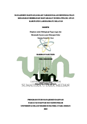 Nasution, Hardian (2024) Manajemen Dakwah Jamaah Tabligh Dalam Meningkatkan Kesadaran Beribadah Masyarakat Di Desa Pinang Awan Kabupaten Labuhanbatu Selatan. Skripsi thesis, Universitas Islam Negeri Sumatra Utara.