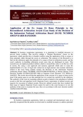 Chandra, Irgi Fahreza (2024) Application of the Ex Aequo Et Bono Principle to the Reconsidered Arbitration Award (Case Study of the Decision of the Indonesian National Arbitration Board (BANI) NUMBER 43032/VI/ARB-BANI/2020). (JLPH) Journal of Law, Politic and Humanities.