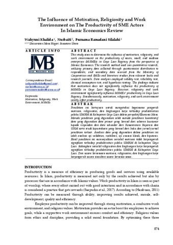 Penelitian ini bertujuan untuk mengetahui bagaimana pengaruh motivasi, religiusitas, dan lingkungan kerja terhadap produktivitias pelaku UMKM di Kabupaten Gayo Lues dalam perspektif Ekonomi Islam. Metode penelitian yang digunakan ialah metode penelitian kuantitatif, data yang digunakan data primer yang berasal dari sebaran kuesioner kepada responden dan data sekunder dari Kementerian Koperasi dan UKM serta studi kepustakaan yang berasal dari buku dan jurnal-jurnal penelitian terkait. Analisis data yang digunakan dalam penelitian ini ialah analisis uji validitias, reabilitas, uji asumsi klasik, dan hipotesis. Hasil penelitian ini menunjukkan variabel motivasi tidak berpengaruh signifikan terhadap produktivitias pelaku UMKM di kabupaten Gayo Lues. Sedangkan variabel religiusitas dan lingkungan kerja berpengaruh signifikan terhadap produktivitias pelaku UMKM di Kabupaten Gayo Lues. Dan secara bersamaan motivasi, religiusitas, dan lingkungan kerja berpengaruh secara simultan secara bersama-sama.