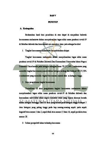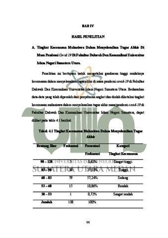 Tujuan penelitian ini adalah untuk mengetahui tingkat kecemasan mahasiswa dalam menyelesaikan tugas akhir masa pendemi Covid-19, mengindentifikasi item pengukuran kecemasan yang capain skornya paling tinggi di kalangan mahasiswa penulis skripsi, dan untuk mengetahui solusi kecemasan dalam prespektif islam. Jenis peneltian ini adalah penelitian deskriptif kuantitatif. Subjek penelitian ini adalah mahasiswa prodi bimbingan penyuluhan islam fakultas dakwah dan komunikasi universitas islam negeri sumatera utara yang berjumlah 209 orang. Sampel yang diambil sebanyak 138 orang mahasiswa. Instrument penelitian yang digunakan adalah kuesioner kecemasan dalam menyelesaikan tugas akhir dengan 35 item. Reabilitas instrumen diukur menggunakan Alfa Cronbach dengan indek 906. teknik analisis data yang digunakan adalah norma kategorisai menurut azwar yang terdiri dari 5 kategori. Hasil penelitian ini menunjukan bahwah tingkat kecemasan mahasiswa dalam menyelesaikan tugas akhir masa pendemi Covid-19 di fakultas dakwah dan komunikasi universitas islam negeri sumatera utara memperlihatkan bahwah, 5 (3,62%) mahasiswa memiliki tingkat kecemasan sangat tinggi. 38 (27,53%) mahasiswa memiliki tingkat kecemasan tinggi. 79 (57,24%) mahasiswa memiliki tingkat kecemasan sedang. 10 (10,86%) mahasiswa memiliki tingkat kecemasan rendah, dan 1 (0,72%) mahasiswa memiliki tingkat kecemasan sangat rendah. Hal tersebut menunjukan bahwa tingkat kecemasan mahasiswa dalam menyelesaikan tugas akhir tergolong pada kategori sedang. Item kecemasan dalam ketegori sangat tinggi pada tiap masing-masing aspek yaitu aspek kognitif item nomor 1 dan 2, aspek fisik item nomor 15 dan 16, dan aspek perilaku item nomor 28. Solusi dalam prespektif islam yang dapat dilakukan yaitu beberapa terapy antara lain: terapy sholat, Terapy dzhikir, Terapy doa, dan Membaca al-qur’an.