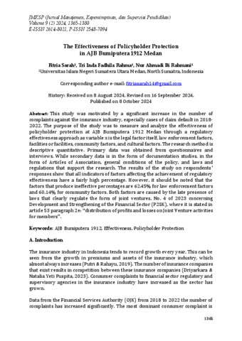 Sarah, Fitria (2024) The Effectiveness of Policyholder Protection in AJB Bumiputera 1912 Medan. JMKSP (Jurnal Manajemen, Kepemimpinan, dan Supervisi Pendidikan), 9 (2).