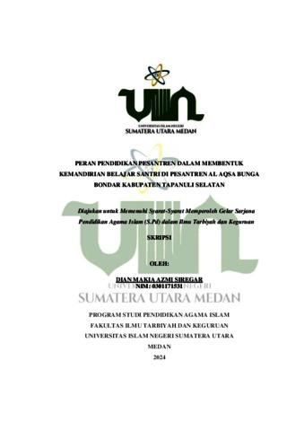Makia Azmi Siregar, Dian (2024) Peran Pendidikan Pesantren Dalam Membentuk Kemandirian Belajar Santri Di Pesantren Al Aqsa Bunga Bondar Kabupaten Tapanuli Selatan. Skripsi thesis, Universitas Islam Negeri Sumatra Utara.