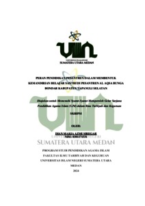 Peranan Pendidikan Pesantren, Kemandirian Belajar Santri Adapun yang dibahas dalam penelitian ini adalah Peran pendidikan pesantren dalam membentuk kemandirian belajar santri di pesantren al Aqsa bunga bondar kabupaten tapanuli selatan. Tujuan penelitian yaitu untuk mengetahui bagaimanakah kemandirian belajar santri di pondok pesantren, bagaimanakah sistem pembelajaran pondok pesantren, bagaimana koordinasi antara pengasuh di pondok pesantren dan bentuk kegiatan yang mendukung kegiatan santri di pondok pesantren bunga bondar kabupaten tapanuli selatan. Pesantren bukan hanya tempat untuk menuntut ilmu agama saja namun lebih jauh lagi para santri dididik dan dibentuk untuk menjadi insan yang paham agama, dan dapat mengaplikasikan ilmunya dalam kehidupan bermasyarakat dan mandiri dalam belajar yaitu aktifitas belajar yang didorong oleh kemauan dan tanggung jawab sendiri tanpa bantuan orang lain . Jenis penelitian ini yaitu kualitatif dengan pendekatan studi kasus. Dengan data dan sumber data dan dikumpul dengan observasi, wawancara dan dokumentasi. Teknik analisis data tersebut yaitu reduksi data, penyajian data dan penarikan kesimpuan. Pengujian keabsahan data yaitu uji kredibilitas data, uji transferbilitas, uji dependabilitas, dan konfirmabiitas. Hasi penelitiannya yaitu bahwa: 1) kemadirian belajar ditanamkan melalui dua cara yaitu teoritis dan praktis. 2) sistem pembelajaran pondok pesantren al aqsa memiliki strategi dalam mengembangkan santrinya melalui keterpaduan dan kesimbangan dalam pembinaan pada santri yang tingaal di pesantren. 3) pengasuh pondok pesantren harus mampu mengambil keputusan secara mandiri (independent) terdahulu jika terdapat problematika. 4) kegiatan yang mendukung kemandirian belajar santri dapat dilihat dari segi metode guru