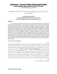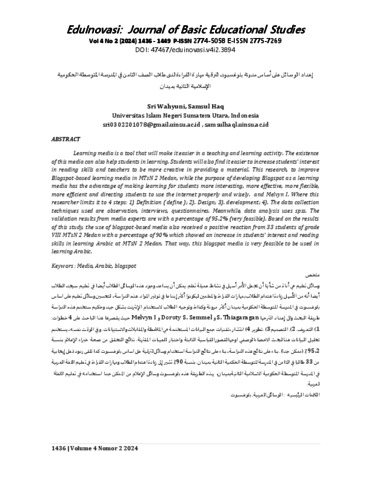 وسائل تعليم هي أداة من شأنها أن تجعل األمر أسهل في نشاط عميلة تعلم. يمكن أن يساعد وجود هذه الوسائل الطالب أيضا في تعليم سيجد الطالب أيضا أنهمناألسهل زيادةاهتمام الطالببمهاراتالقراءةواملعلمين ليكونوا أكثر إبداعا في توفير املواد. هذه الدراسة، لتحسين وسائل تعليم على اساس بلوغسبوت في املدرسة املتوسطة الحكومية بميدان أكثر مرونة وكفاءة وتوجيه الطالب الستخدام اإلنترنت بشكل جيد وحكيم ستخدم هذه الدراسة طريقة البحث وال إعداد اقترحها Thiagaragan .S و Semmel .S Doroty و I Melvyn حيث يقصرها هذا الباحث على 4 خطوات: 1( التعريف. 2(. التصميم 3( .تطوير 4( انتشار .تقنيات جمع البيانات املستخدمة هي املالحظة واملقابالتواالستبيانات. وفي الوقت نفسه، يستخدم تحليل البيانات هذالبحث االحصاءالوصفي اوجهالقصورالقياسية الثابتة واختبار للعيبات املقترنة. نتائج التحقق من صحة خبراء اإلعالم بنسبة ٪95.2 )ممكن جدا(. بناء على نتائج هذهالدراسة، بناء علىنتائج الدراسةاستخدام وسائل لترقية عل اساس بلوغسبوت كما تلقى ردودفعل إيجابية من 33 طالبا في الثامن فياملدرسةاملتوسطة الحكمية الثانية بميدان. بنسبة ٪90تشيرإلىزيادةاهتمام الطالبومهاراتالقراءةفي تعليم اللغة العربية في املدرسة املتوسطة الحكومية االسالمية الثانيةبميدان. بهذه الطريقة هذه بلوغسبوت وسائل اإلعالم من املمكن جدا استخدامه في تعليم اللغةا لعربية